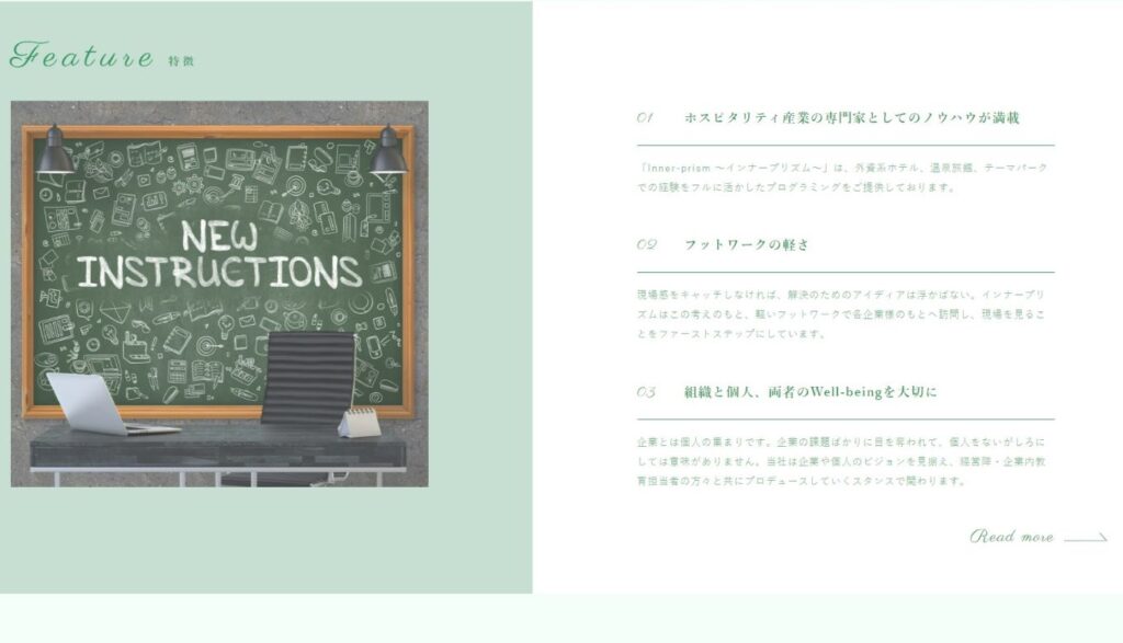 インナープリズムの特徴の一つとして挙げられるのが、専門家としてのノウハウが多く蓄積されているという点です。インナープリズムでは外資系ホテルをはじめ、温泉旅館やテーマパークなどホスピタル産業において数多くのサービスを提供してきた実績があります。そうした経験をフルに活用したプログラミングを提供することが可能となっています。